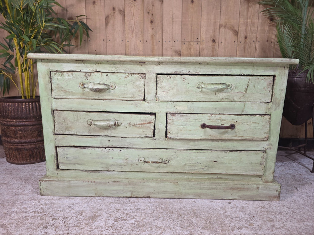 This antique Indian solid wooden merchants chest would have originally been used by a merchant to carry their tools, etc whilst travelling by ship, it has been later painted in a fabulous green colour, measuring 54 cm in height, 92 cm in length, and 60 cm in width, serves as a unique and functional piece of furniture. With its sturdy construction and traditional design, it can be a stylish addition to any home as a coffee table or side table chest. Perfect for those who appreciate craftsmanship and historical charm in their décor, this piece embodies the rich heritage and beauty of Indian furniture design.