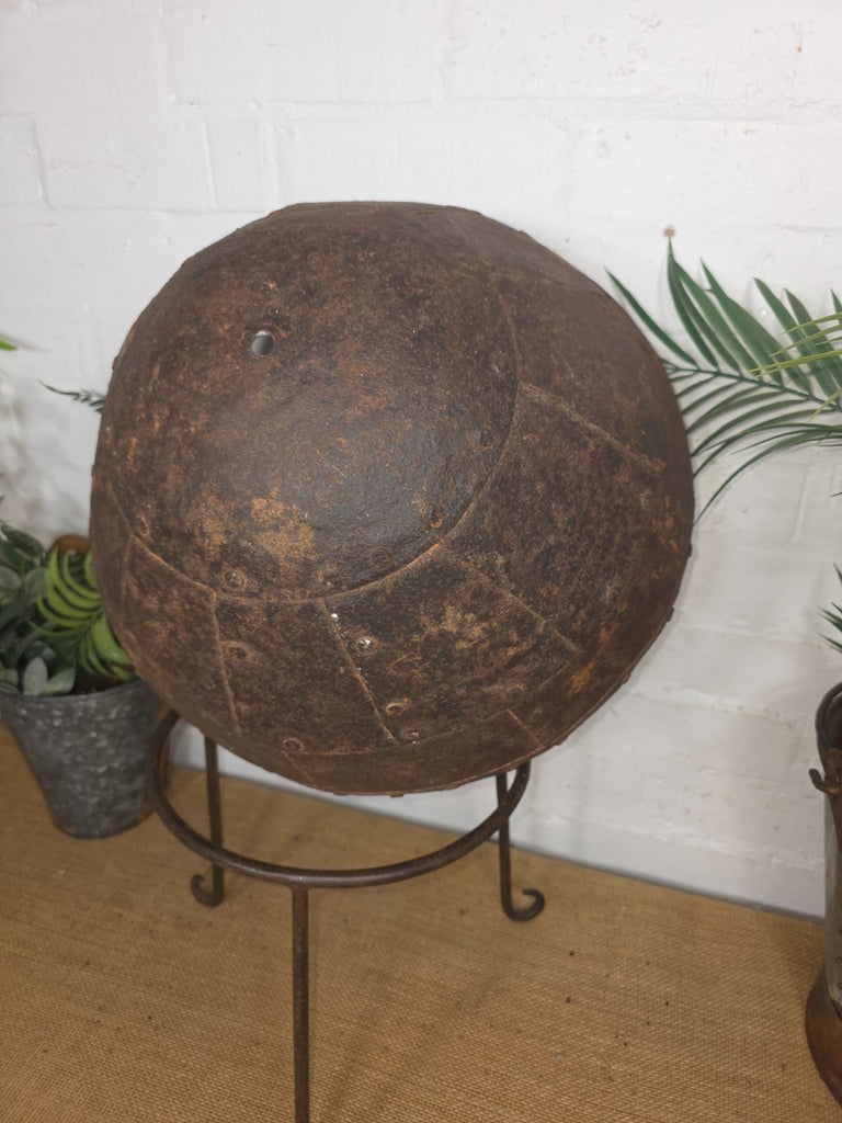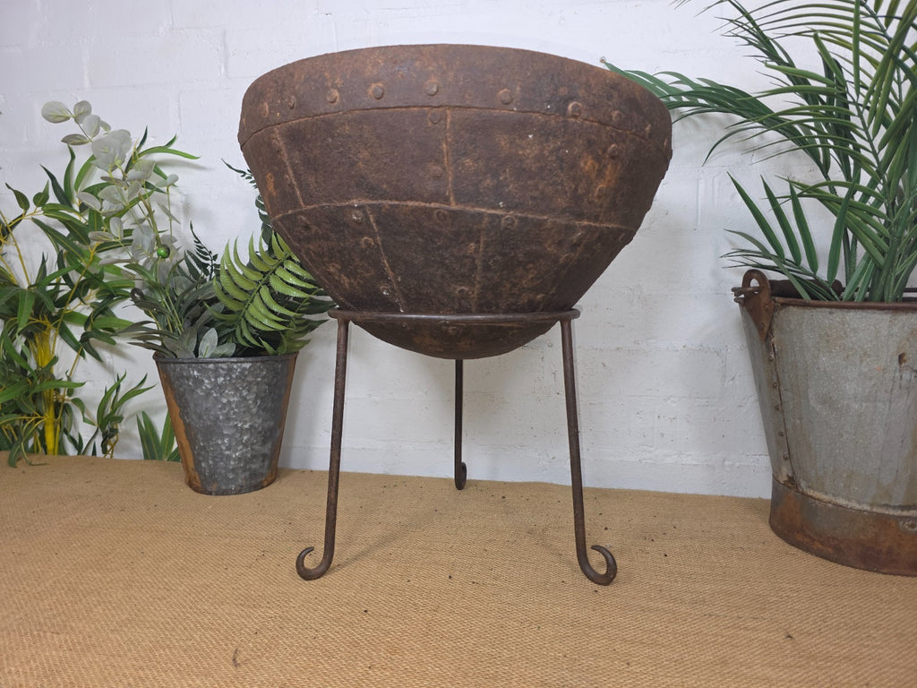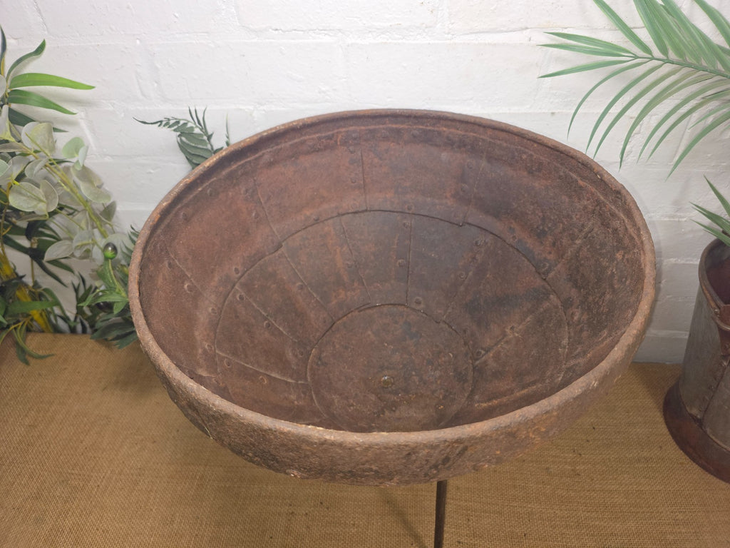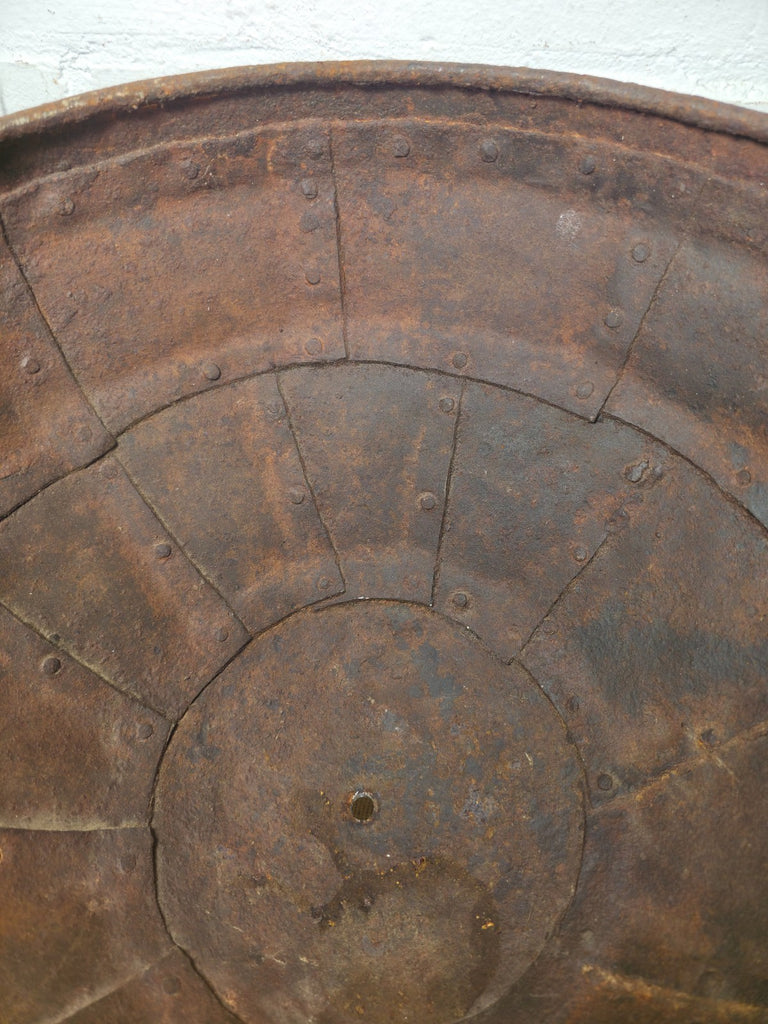 This large old heavy-duty original Indian antique riveted iron bowl is a very unique and interesting piece dating to circa early 20th century originally used for cooking it now serves multiple functions as a garden planter, drinks cooler or fire pit. Hand made from sturdy iron, this versatile piece can be used outside, making it ideal for gatherings in your garden or patio. The traditional Indian style adds a unique touch to your outdoor space while providing a practical and stylish way to enjoy outdoor heating and cooking.