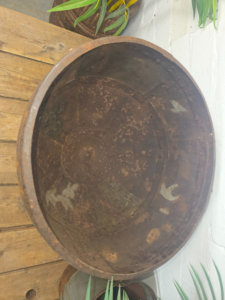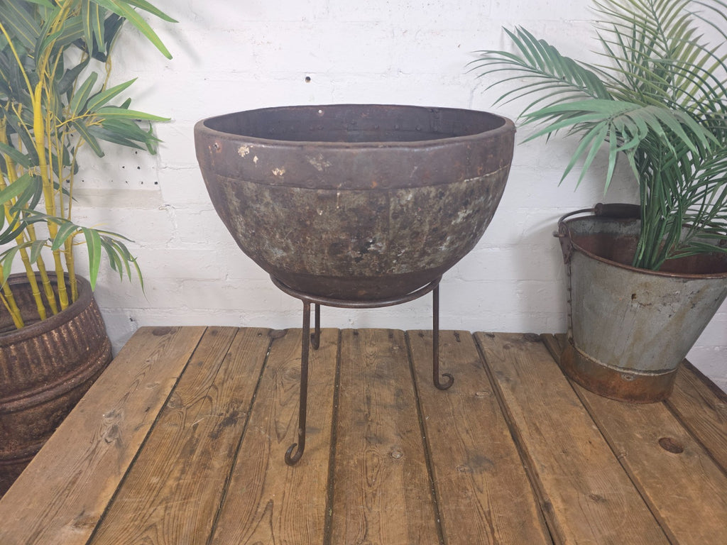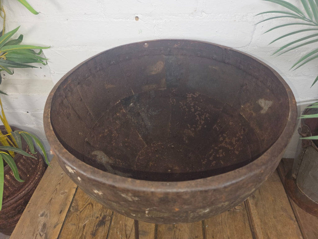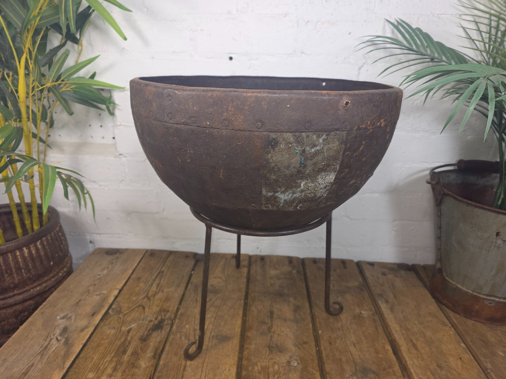This large old heavy-duty original Indian antique riveted iron bowl is a very unique and interesting piece dating to circa early 20th century originally used for cooking it now serves multiple functions as a garden planter, drinks cooler or fire pit. Hand made from sturdy iron, this versatile piece can be used outside, making it ideal for gatherings in your garden or patio. The traditional Indian style adds a unique touch to your outdoor space while providing a practical and stylish way to enjoy outdoor heating and cooking.