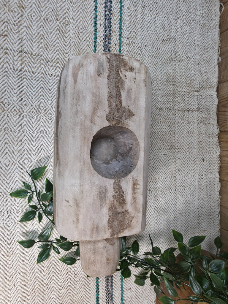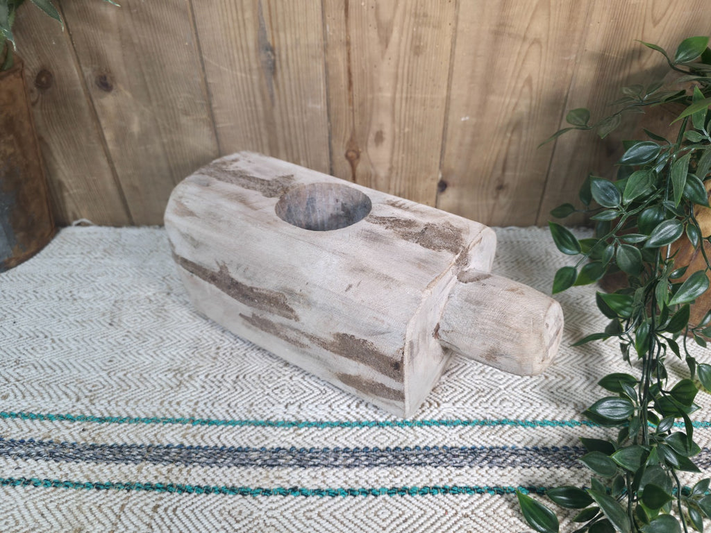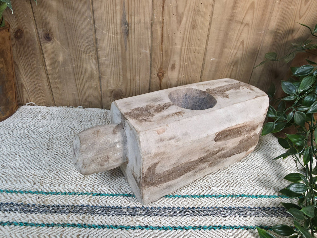 This old vintage rustic wabi sabi hand carved wooden bowl is a unique and charming addition to any home décor. Originally used for grinding herbs and spices the intricate design and craftsmanship of the piece make it a standout piece in any room. The wabi sabi aesthetic, with its natural imperfections and rustic finish, adds a sense of authenticity and character to your space. Perfect as a decorative accent, this piece is sure to be a conversation starter in your home.