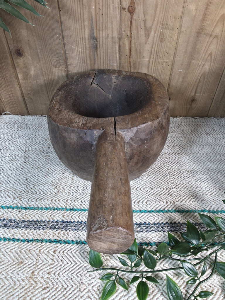 This old vintage rustic wabi sabi hand carved wooden bowl is a unique and charming addition to any home décor. Originally used for grinding herbs and spices the intricate design and craftsmanship of the piece make it a standout piece in any room. The wabi sabi aesthetic, with its natural imperfections and rustic finish, adds a sense of authenticity and character to your space. Perfect as a decorative accent, this piece is sure to be a conversation starter in your home.