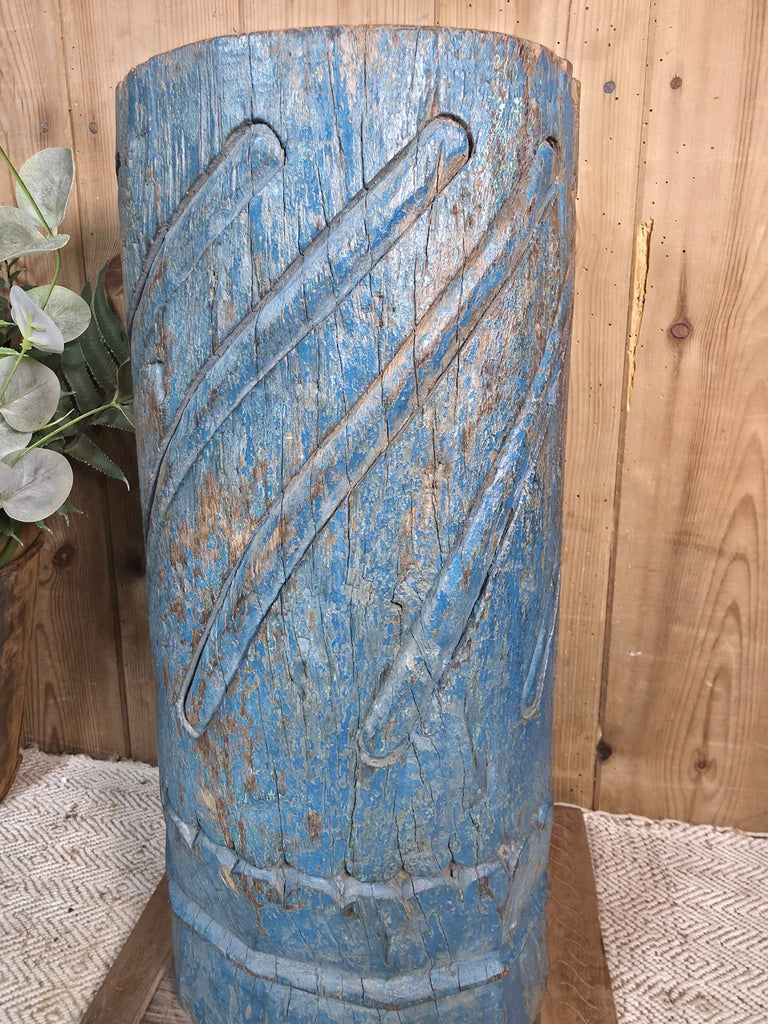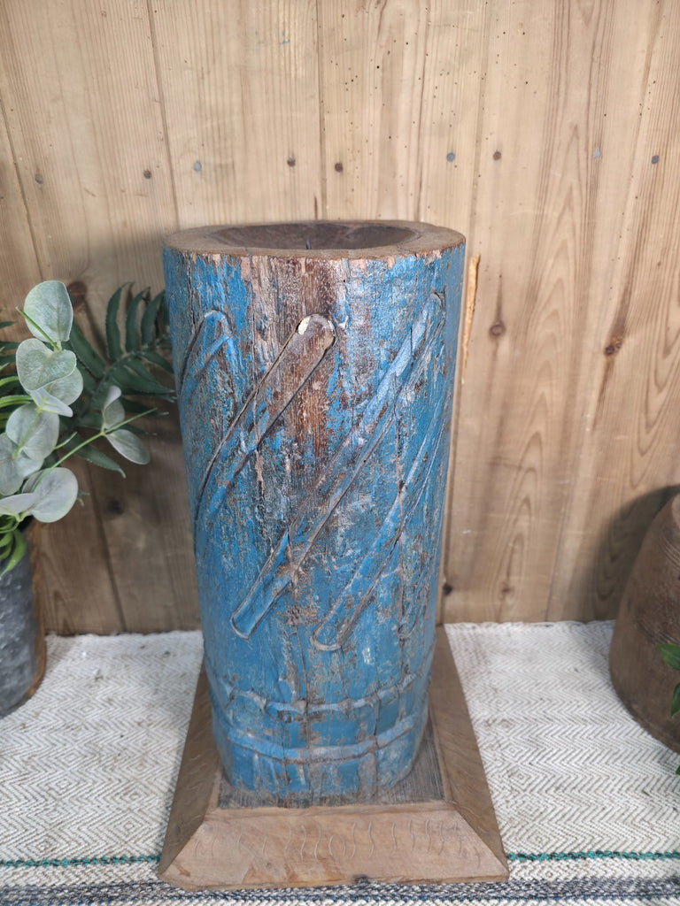 Add a touch of elegance to your home décor with this large reclaimed Indian wooden pillar base candle holder. Made using a old original antique Indian wooden column salvaged from a temple or other significant building. The intricate hand carvings and stunning patina will add a unique and beautiful touch to your living space. Perfect for holding your favourite candle, this plinth will create a warm and inviting ambiance in any room. Crafted with care, this plinth is not only functional but also a beautiful decorative piece. The wooden pillar base is perfect for those who appreciate vintage and handmade items with a history. Ideal for use in any room of your home, this candle holder plinth is a must-have for any candle lover.