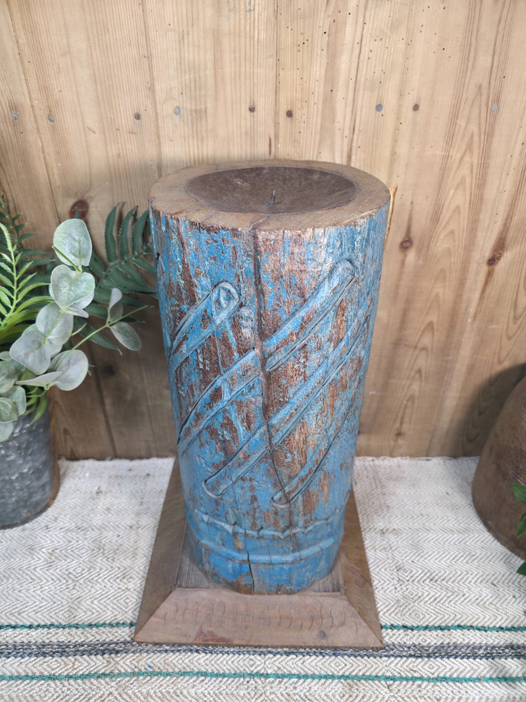 Large Vintage Reclaimed Carved Indian Solid Wooden Pillar Column Candle Holder