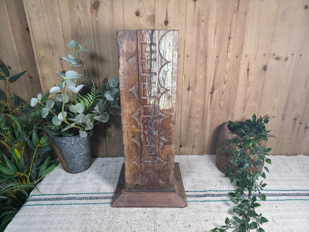 Add a touch of elegance to your home décor with this large reclaimed Indian wooden pillar base candle holder. Made using a old original antique Indian wooden column salvaged from a temple or other significant building. The intricate hand carvings and stunning patina will add a unique and beautiful touch to your living space. Perfect for holding your favourite candle, this plinth will create a warm and inviting ambiance in any room. Crafted with care, this plinth is not only functional but also a beautiful decorative piece. The wooden pillar base is perfect for those who appreciate vintage and handmade items with a history. Ideal for use in any room of your home, this candle holder plinth is a must-have for any candle lover.