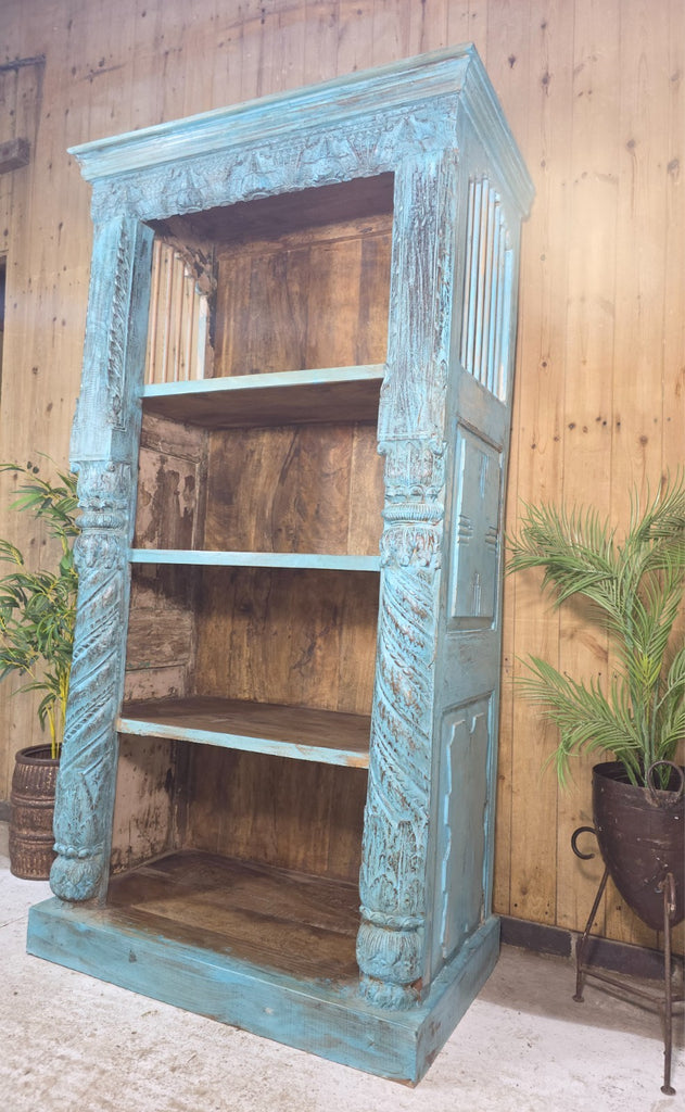 Large Vintage Reclaimed Hand Carved Indian Solid Wooden Bookcase Shelving Unit