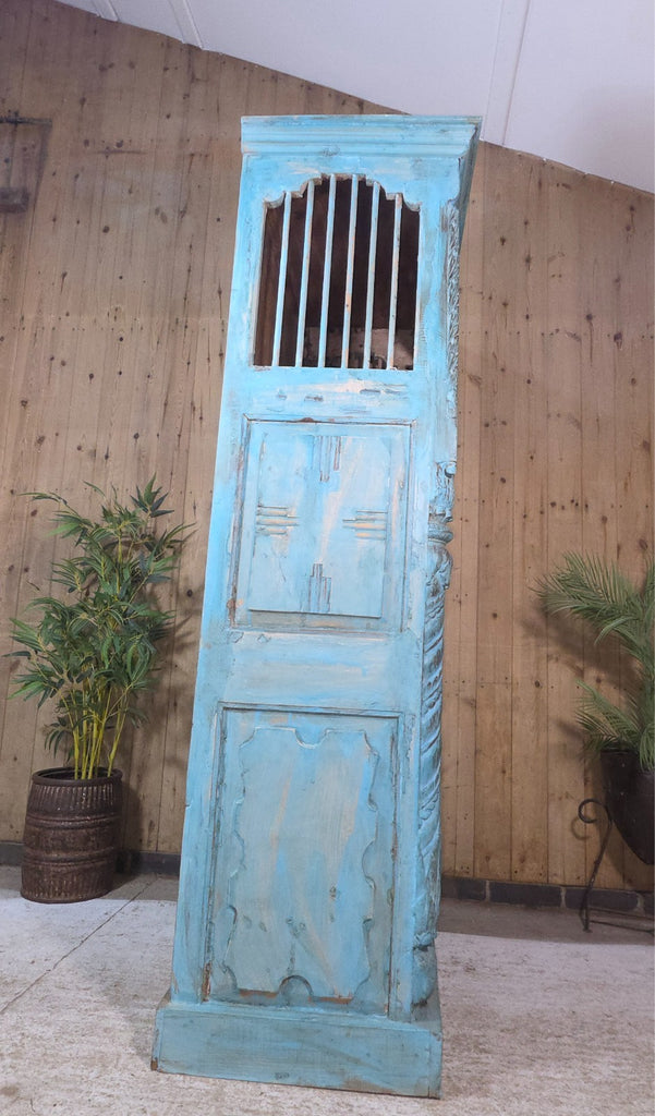 This large vintage reclaimed hand-carved Indian solid wooden shelving unit is a striking piece of furniture, with 3 shelves providing ample storage space for books and decorative items. Standing at 189 cm tall, 102 cm long, and 52 cm wide, this bookcase is not only functional but also adds a touch of rustic charm to any room. Hand made using reclaimed wood this beautiful bookcase features antique side panels with iron bars combined with intricate hand carved pillars and a solid wooden construction which gives it a unique and timeless appeal, making it a standout feature in any home or retail environment.