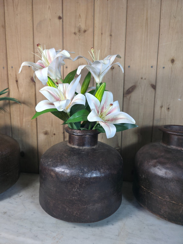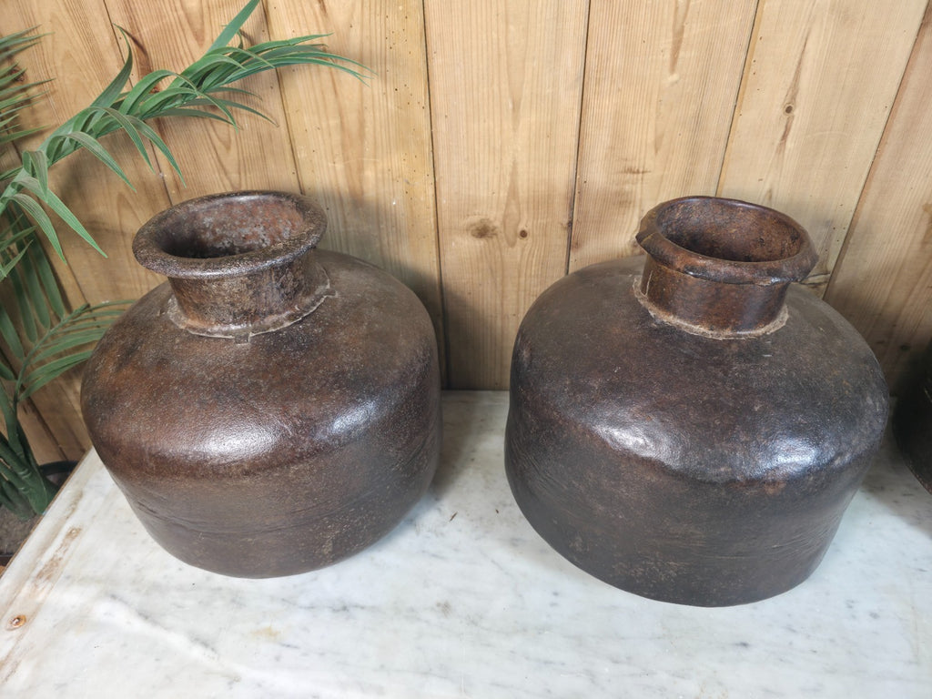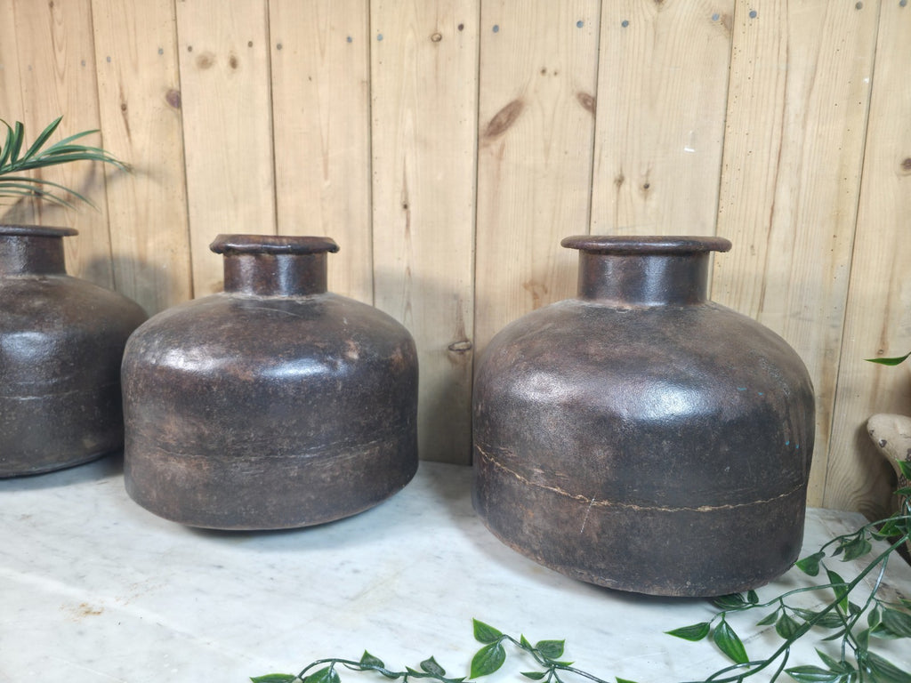These rustic iron Indian water pots exudes a sense of vintage charm and Wabi Sabi aesthetics. With their heavy-duty construction and rich cultural heritage these make a unique addition to any home or garden décor. Originally used for transporting water from the local village well, they make a wonderful display piece, whether used alone or with dry flowers their sure to impress, this item adds a touch of old-world elegance to any space.