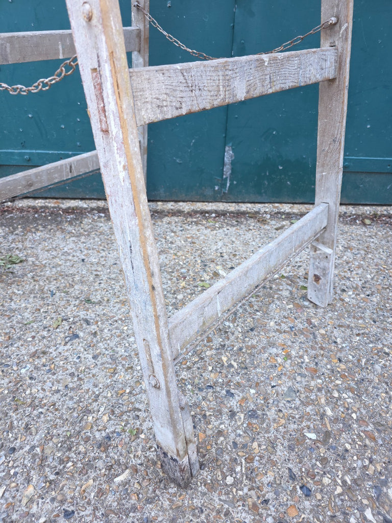 These Vintage French Pine Wooden Trestle Ladders are a charming and unique piece of furniture, perfect for displaying items in a workshop or home setting. The wooden construction adds a touch of rustic elegance, while the ladder design offers a functional and stylish storage solution. Ideal for weddings or special occasions, this ladder can showcase personal items or decorative items in a creative way. Its vintage appeal adds character and charm to any space, making it a versatile and eye-catching piece for any DIY enthusiast.
