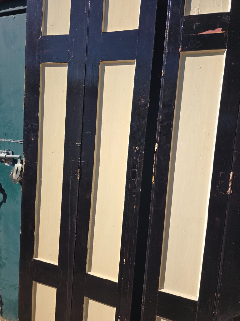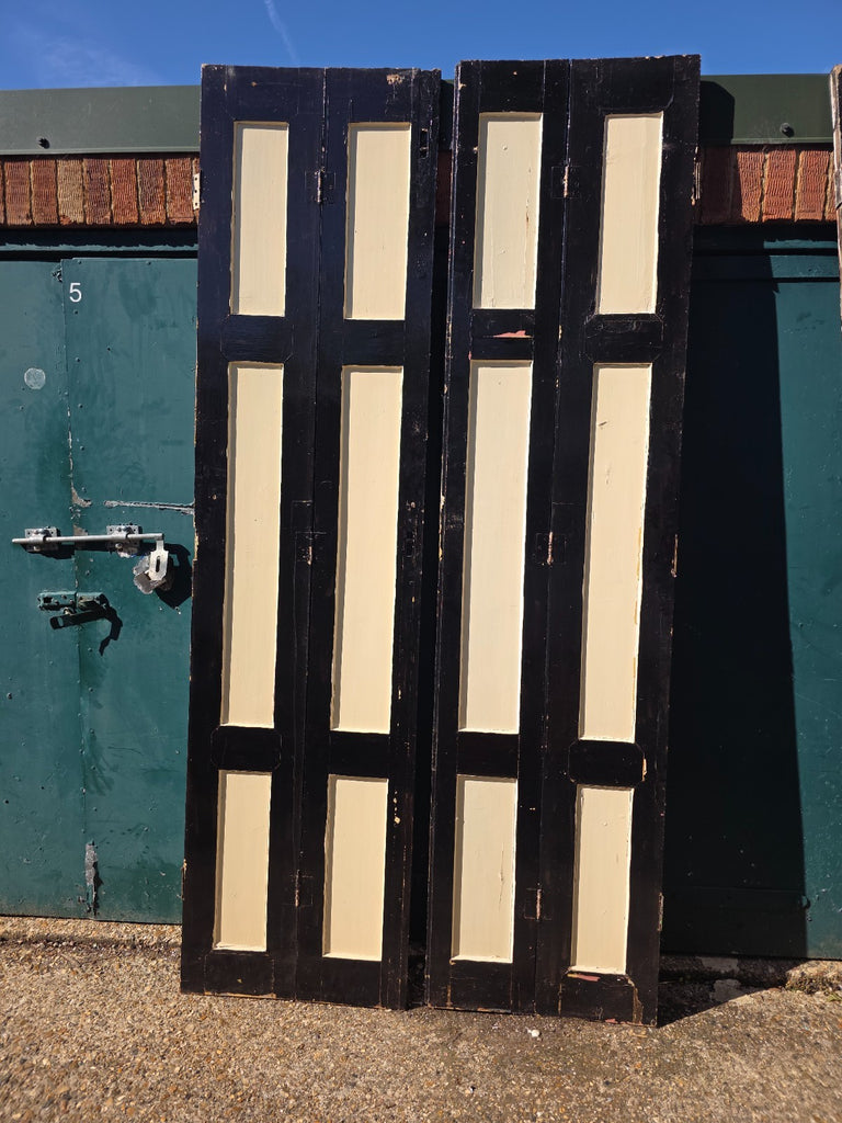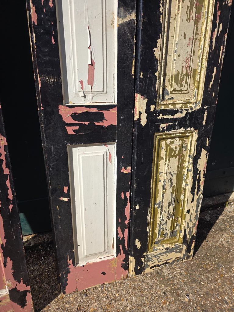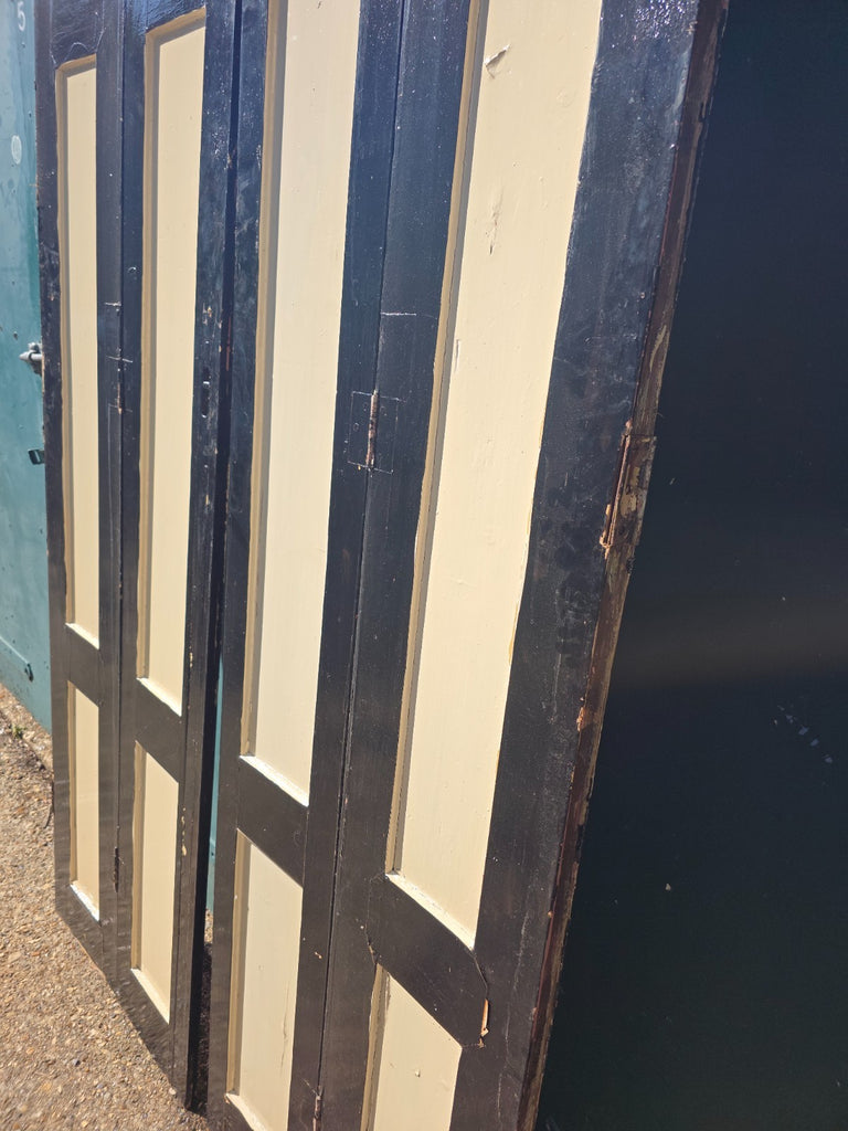 Stunning set of old original French wooden bi folding window/door shutters with panelled detailing. Ideal for use as room dividers, interior design projects, wardrobe doors etc. Great look and patina