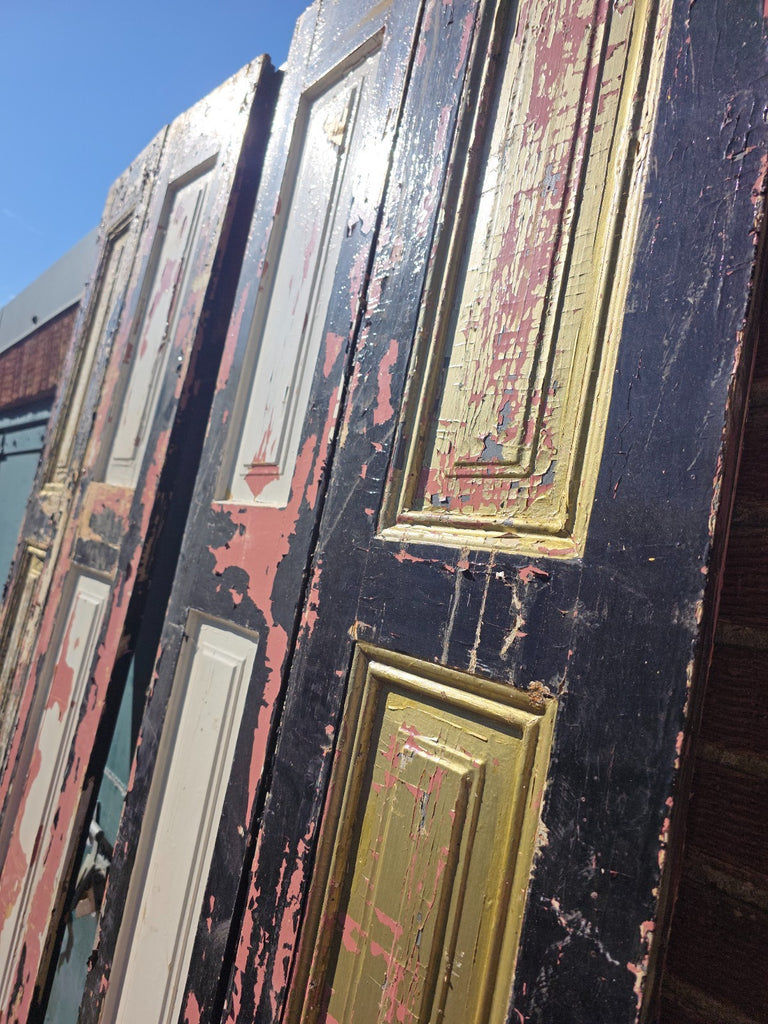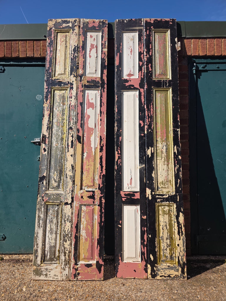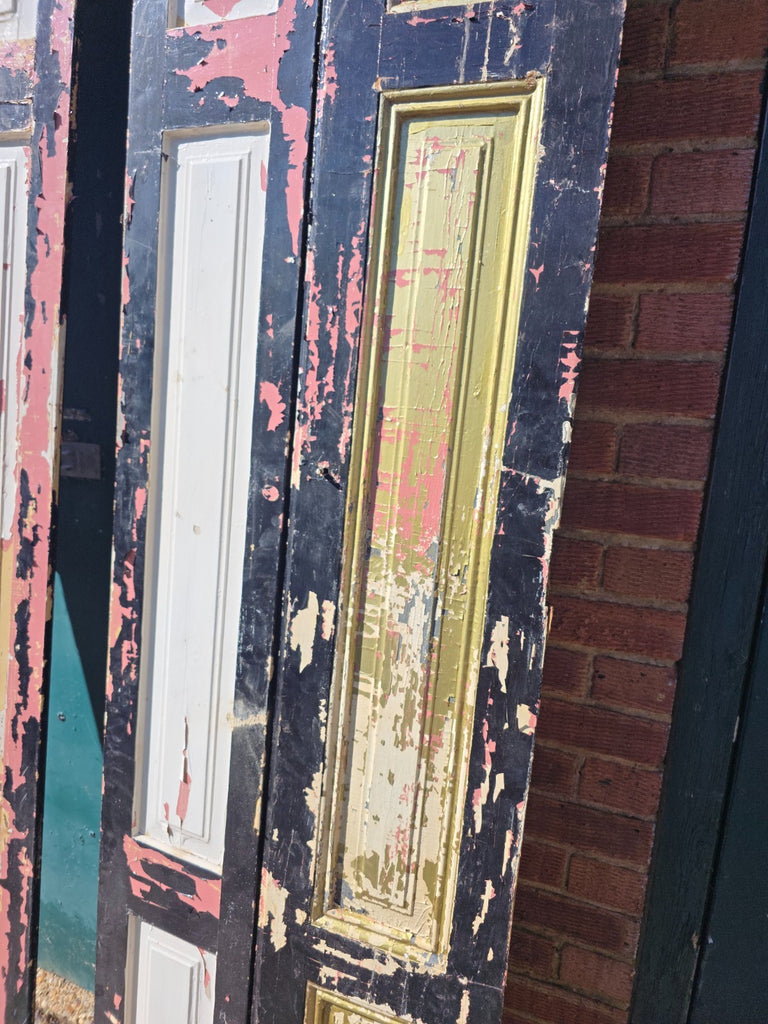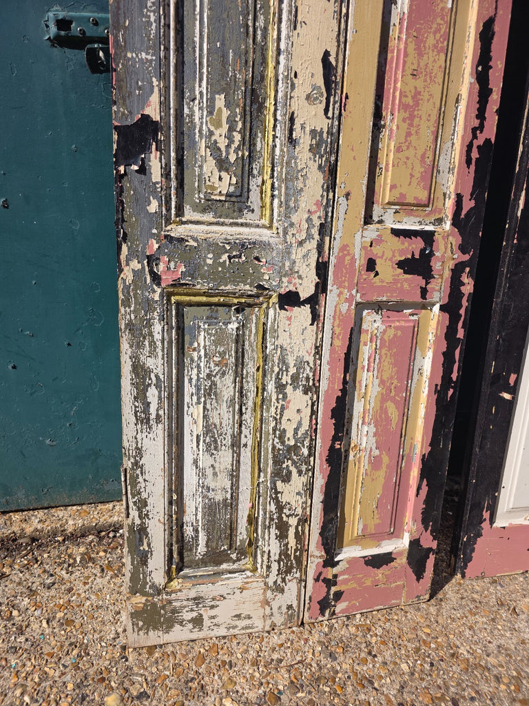 Stunning set of old original French wooden bi folding window/door shutters with panelled detailing. Ideal for use as room dividers, interior design projects, wardrobe doors etc. Great look and patina