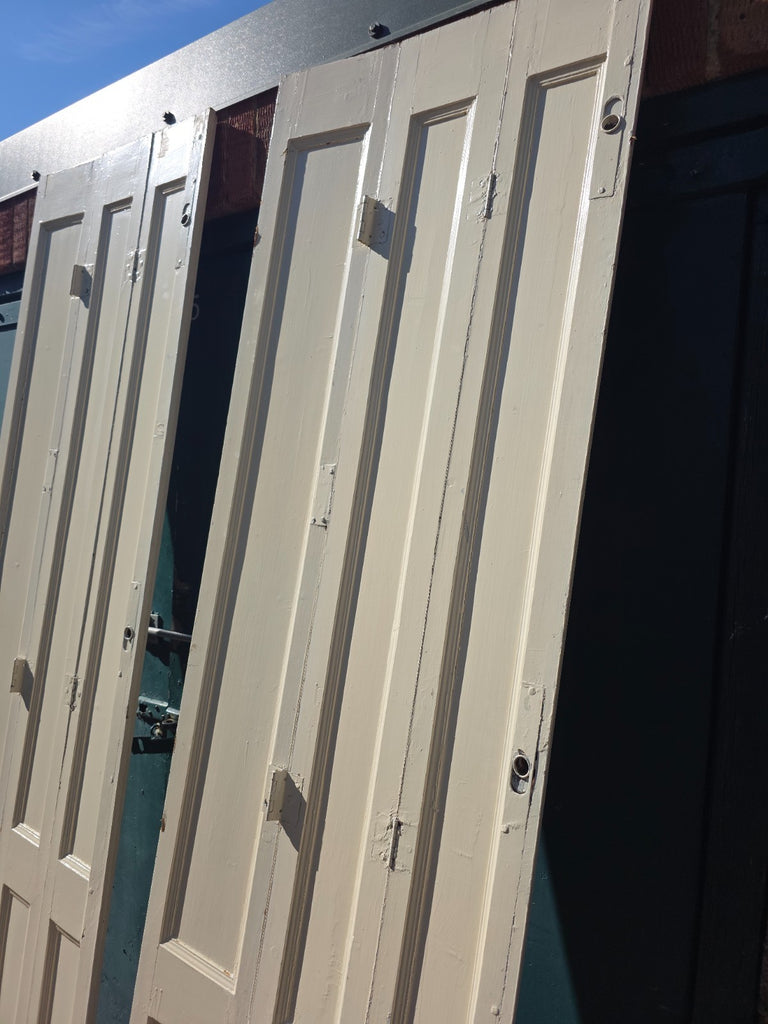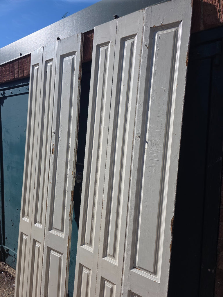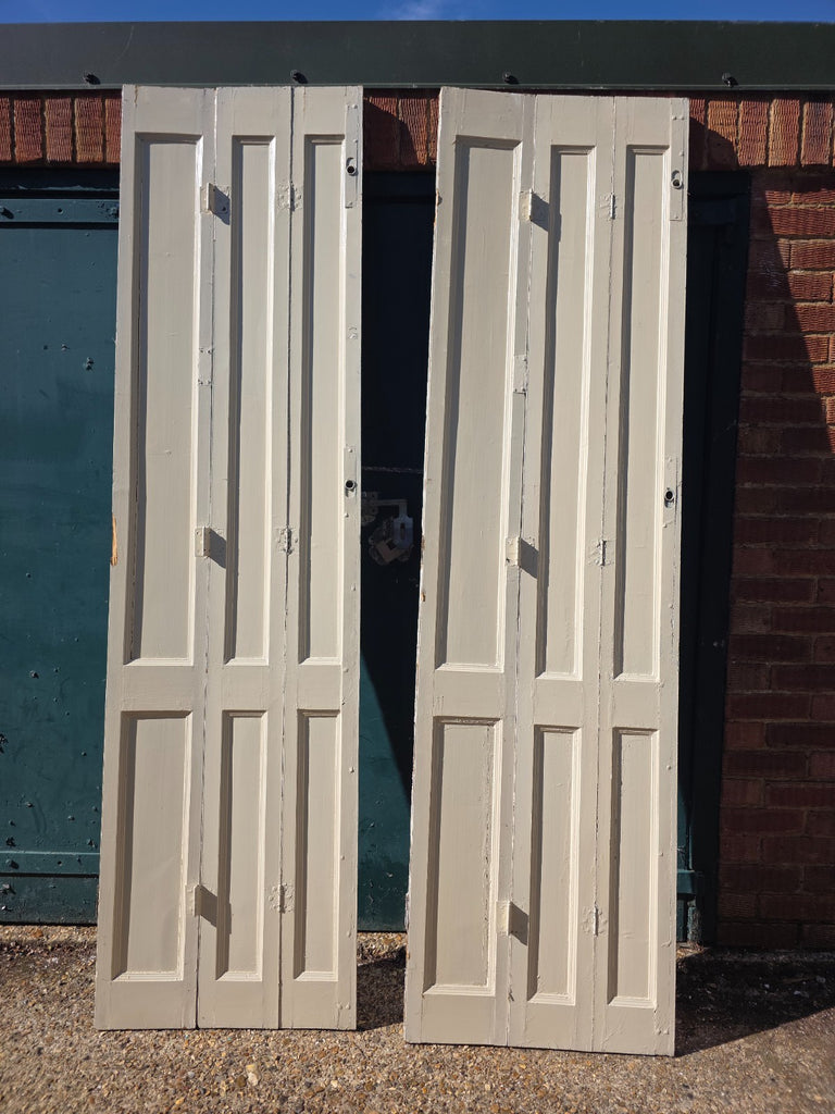 Stunning set of old original French wooden Tri folding window/door shutters with panelled detailing. Ideal for use as room dividers, interior design projects, wardrobe doors etc. Great look and patina