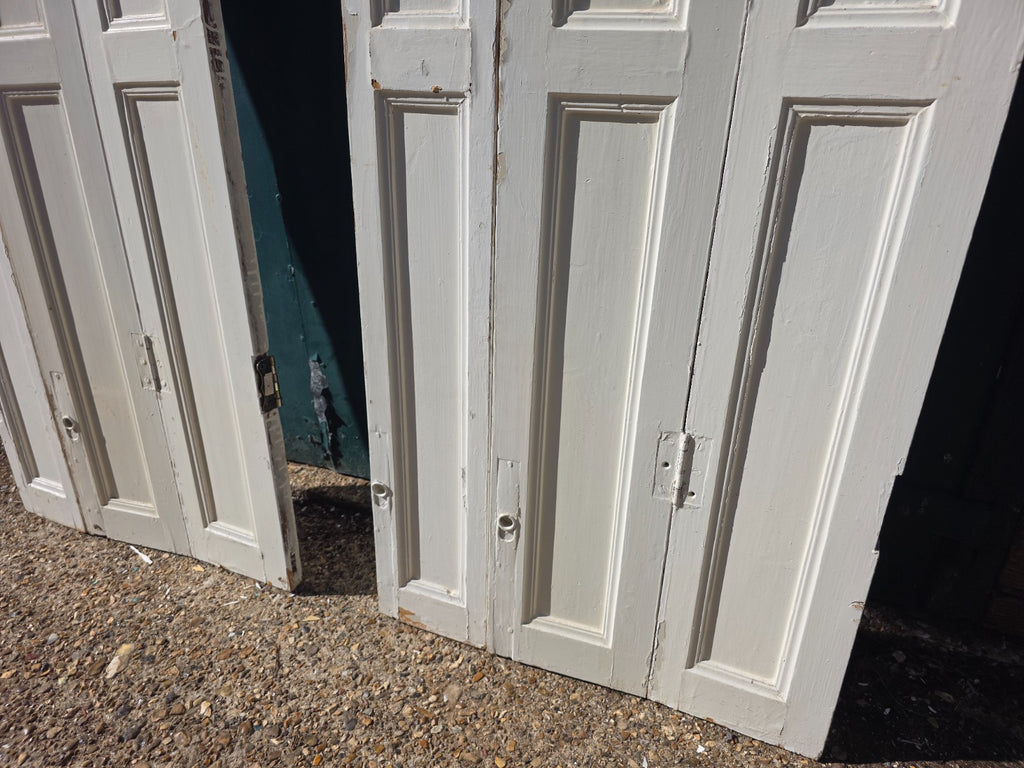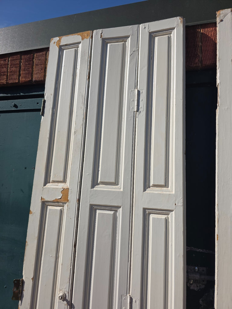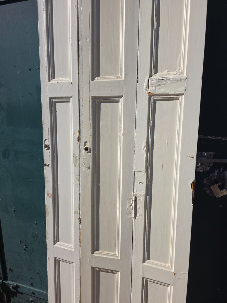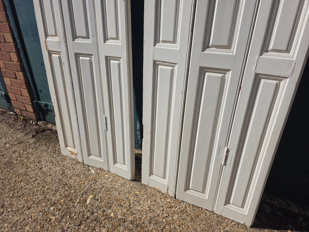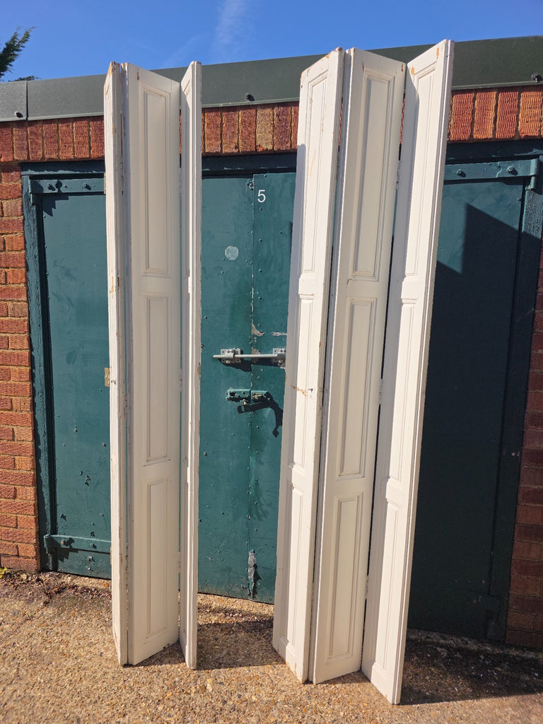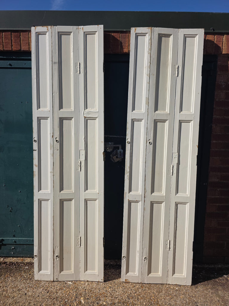 Stunning set of old original French wooden Tri folding window/door shutters with panelled detailing. Ideal for use as room dividers, interior design projects, wardrobe doors etc. Great look and patina