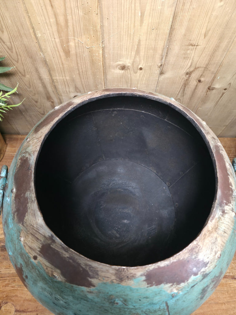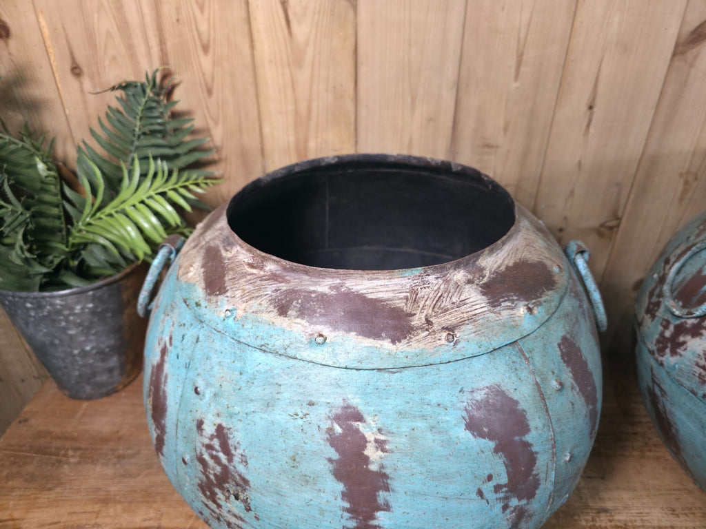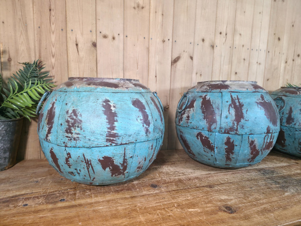 Vintage Reclaimed Rustic Hand Made Blue Riveted Iron Ball Garden Planter Pot