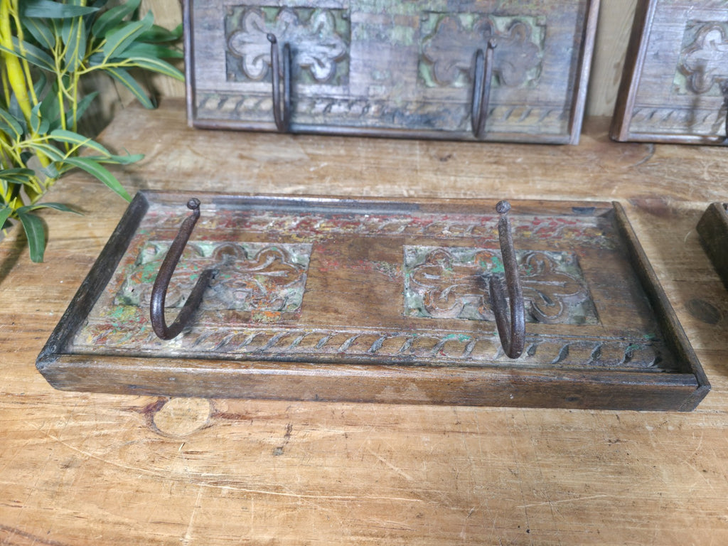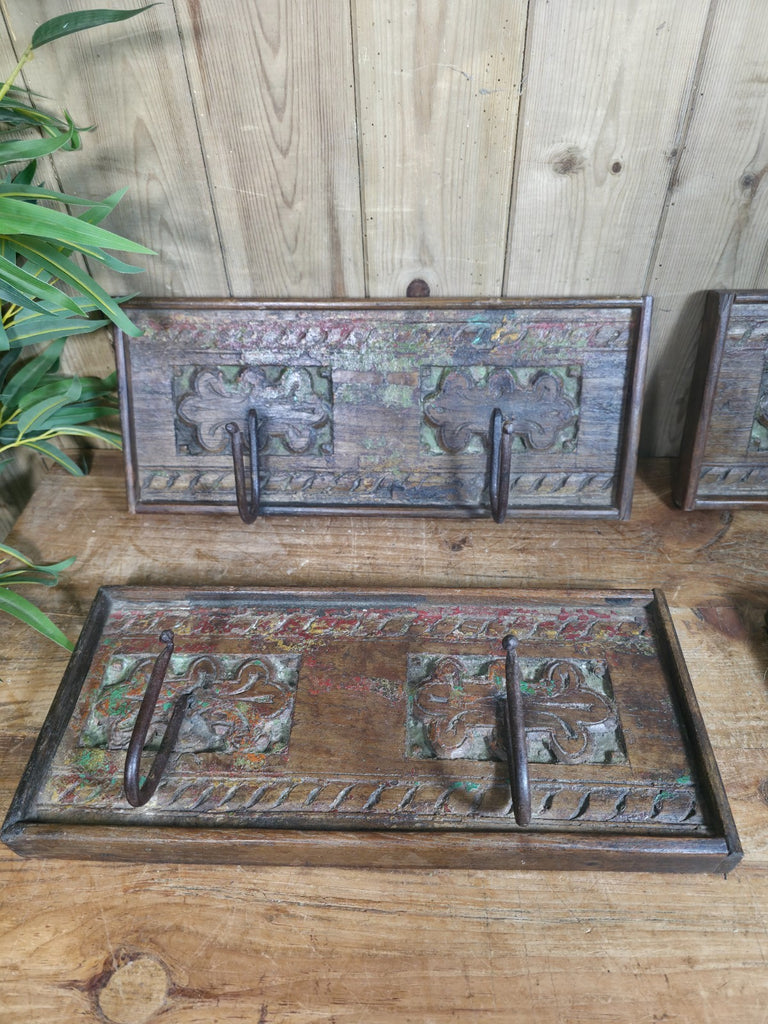Vintage Rustic Hand Carved Reclaimed Indian Wooden Coat Hooks