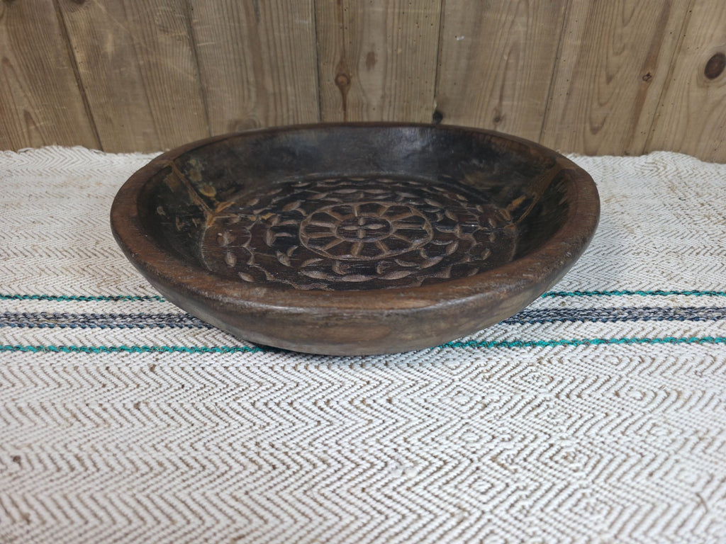 This vintage rustic Wabi Sabi Indian hand-carved wooden dough bowl is a unique and decorative piece for your home. The intricate designs and craftsmanship add a touch of authenticity and character to any space. Perfect for displaying fruits, nuts, or potpourri, or simply as a statement piece on a shelf or table. Its timeless appeal and natural beauty make it a versatile addition to any home décor style.