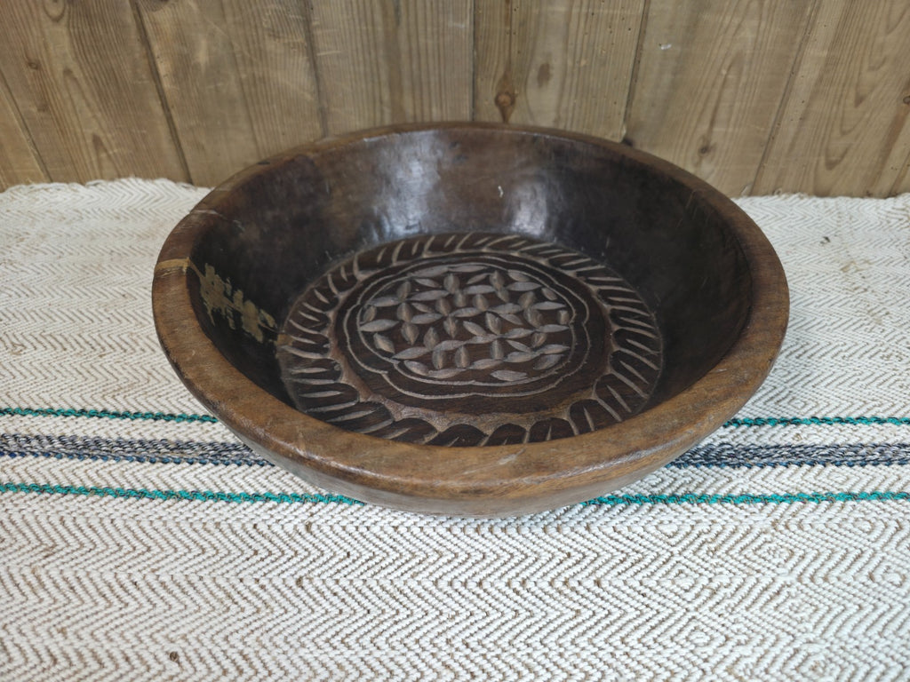 This vintage rustic Wabi Sabi Indian hand-carved wooden dough bowl is a unique and decorative piece for your home. The intricate designs and craftsmanship add a touch of authenticity and character to any space. Perfect for displaying fruits, nuts, or potpourri, or simply as a statement piece on a shelf or table. Its timeless appeal and natural beauty make it a versatile addition to any home décor style.